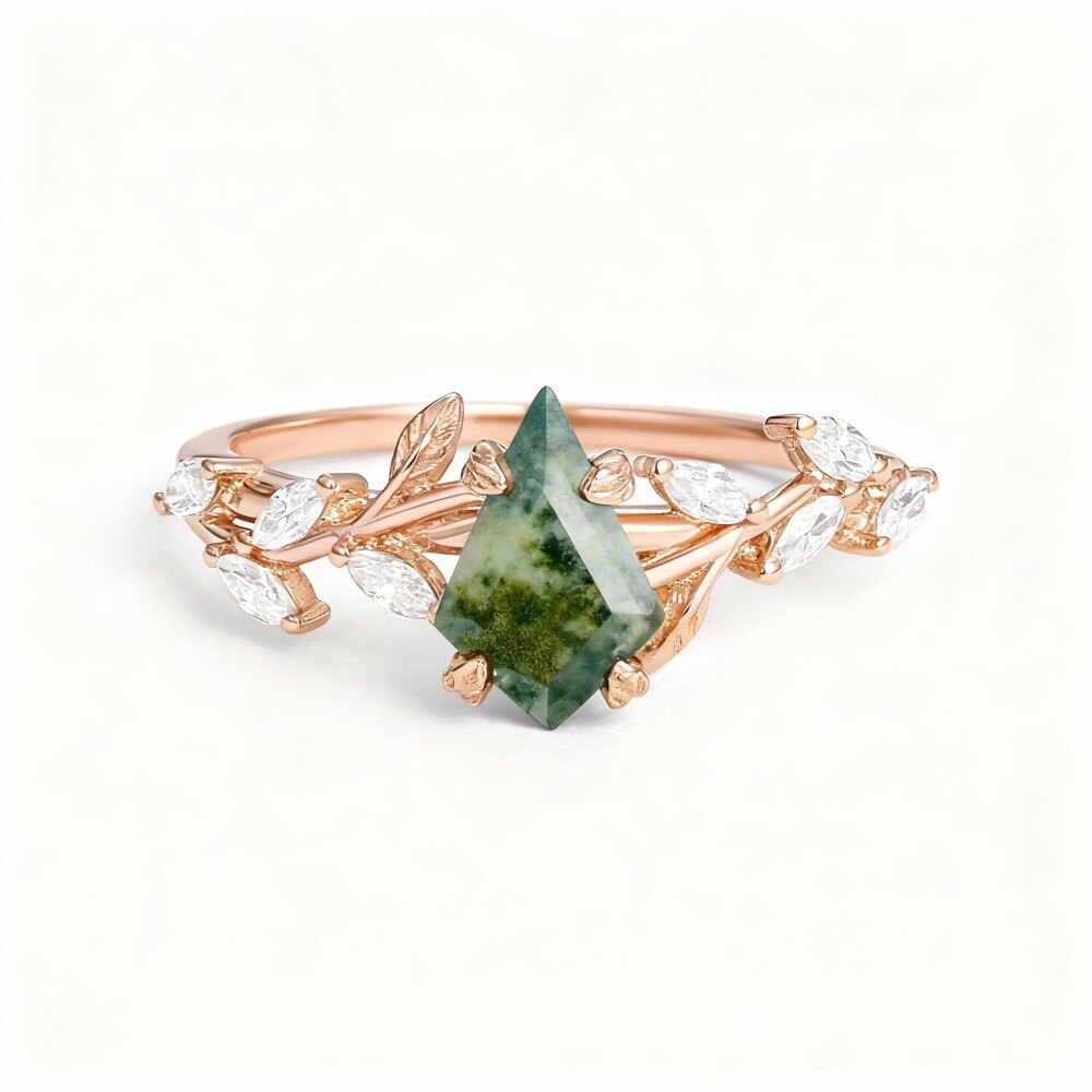Découvrez le charme exquis de notre bague de fiançailles en Or Rose 10 carats, conçue pour les femmes modernes qui apprécient l'élégance de la haute joaillerie. Cette pièce sublime est Or Rosenée d'une magnifique agate mousse centrale, de 1 à 6 carats, pour un ajustement parfait à tous les goûts. Sublimée par des moissanites latérales étincelantes totalisant 0,45 carat, son poli, sa taille et sa symétrie exceptionnels créent un attrait visuel captivant qui brille de mille feux à chaque mouvement. Sublimez votre histoire d'amour avec cette bague remarquable, alliant sophistication et qualité, le choix idéal pour vos fiançailles.