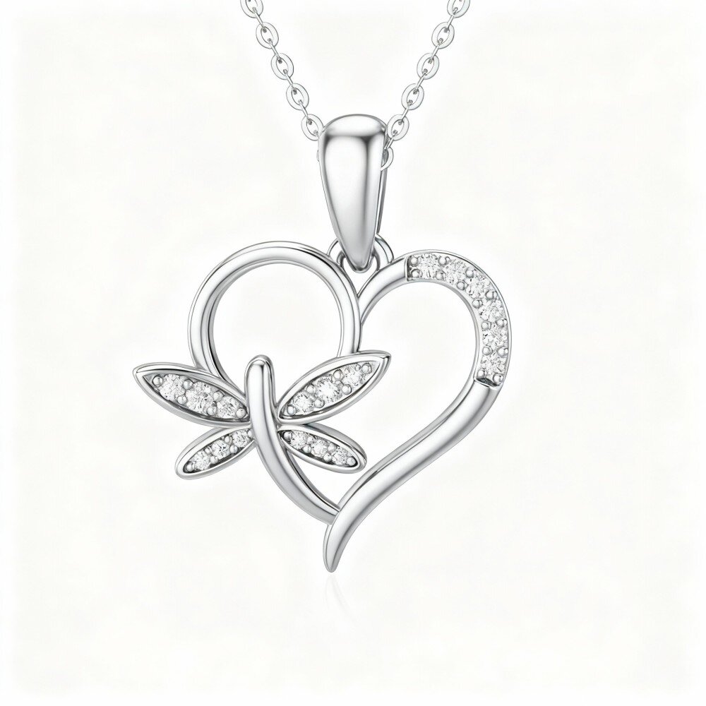 Découvrez la beauté unique de notre collier pendentif en Or Blanc 10K, présentant des motifs de libellule et de cœur, Or Blancné de zircon cubique étincelant pour une touche d'élégance.