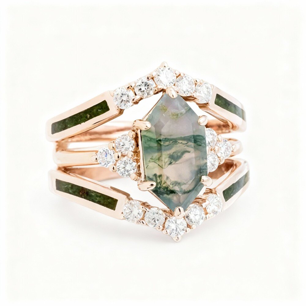 Notre bague de fiançailles d'inspiration vintage met en valeur la beauté de l'Or Rose 14 carats, méticuleusement travaillée pour sublimer son éclat. La captivante pierre centrale en agate mousse, réputée pour ses motifs et ses couleurs uniques, rayonne au cœur de la bague, tandis que les pierres latérales en moissanite scintillantes offrent un contraste éclatant, capturant la lumière sous tous les angles. Avec un poids total allant jusqu'à 6 carats pour la pierre centrale et 0,75 carat pour les pierres latérales, cette bague est un véritable investissement en matière de qualité et de savoir-faire. Célébrez votre histoire d'amour avec une pièce alliant luxe et touche personnelle, un souvenir précieux pour les années à venir.