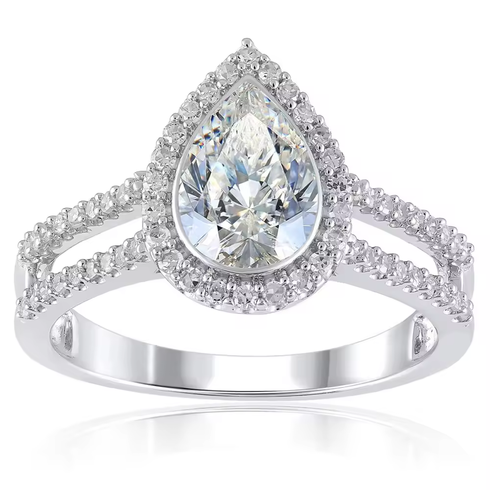 Featuring a stunning large center lab-grown diamond surrounded by a halo of matching lab-created side stones, this ring maximizes brilliance and fire while maintaining ethical sourci